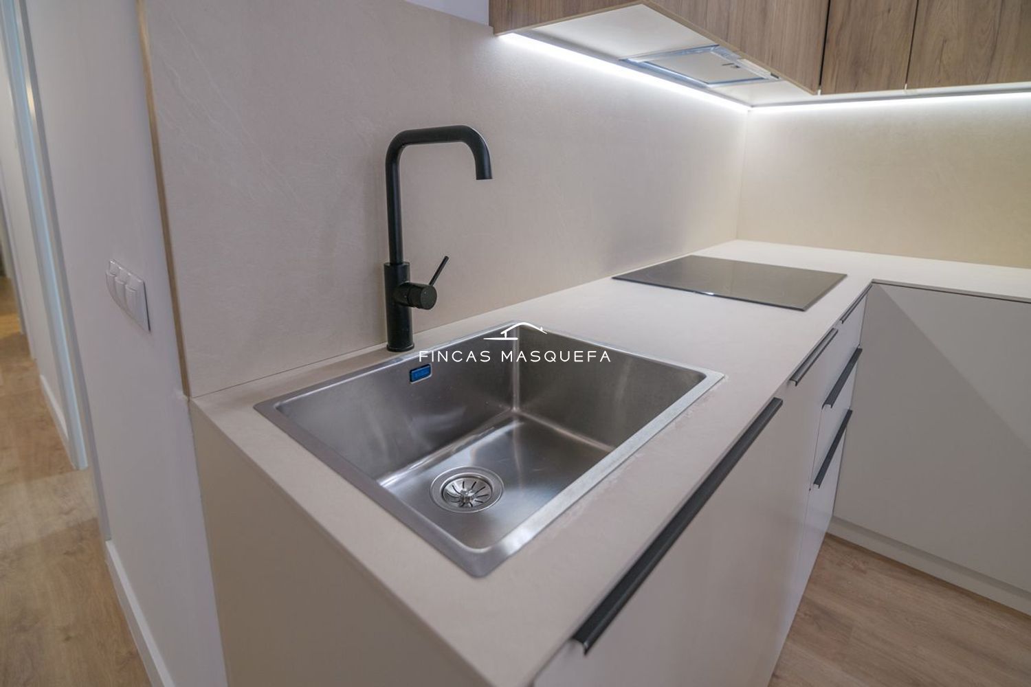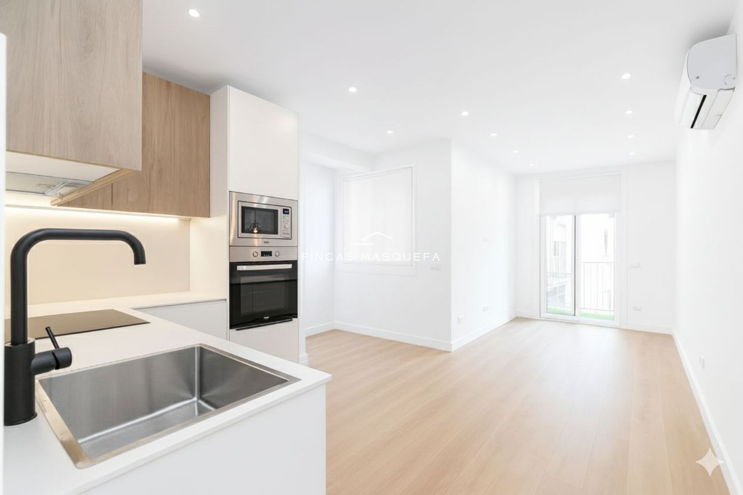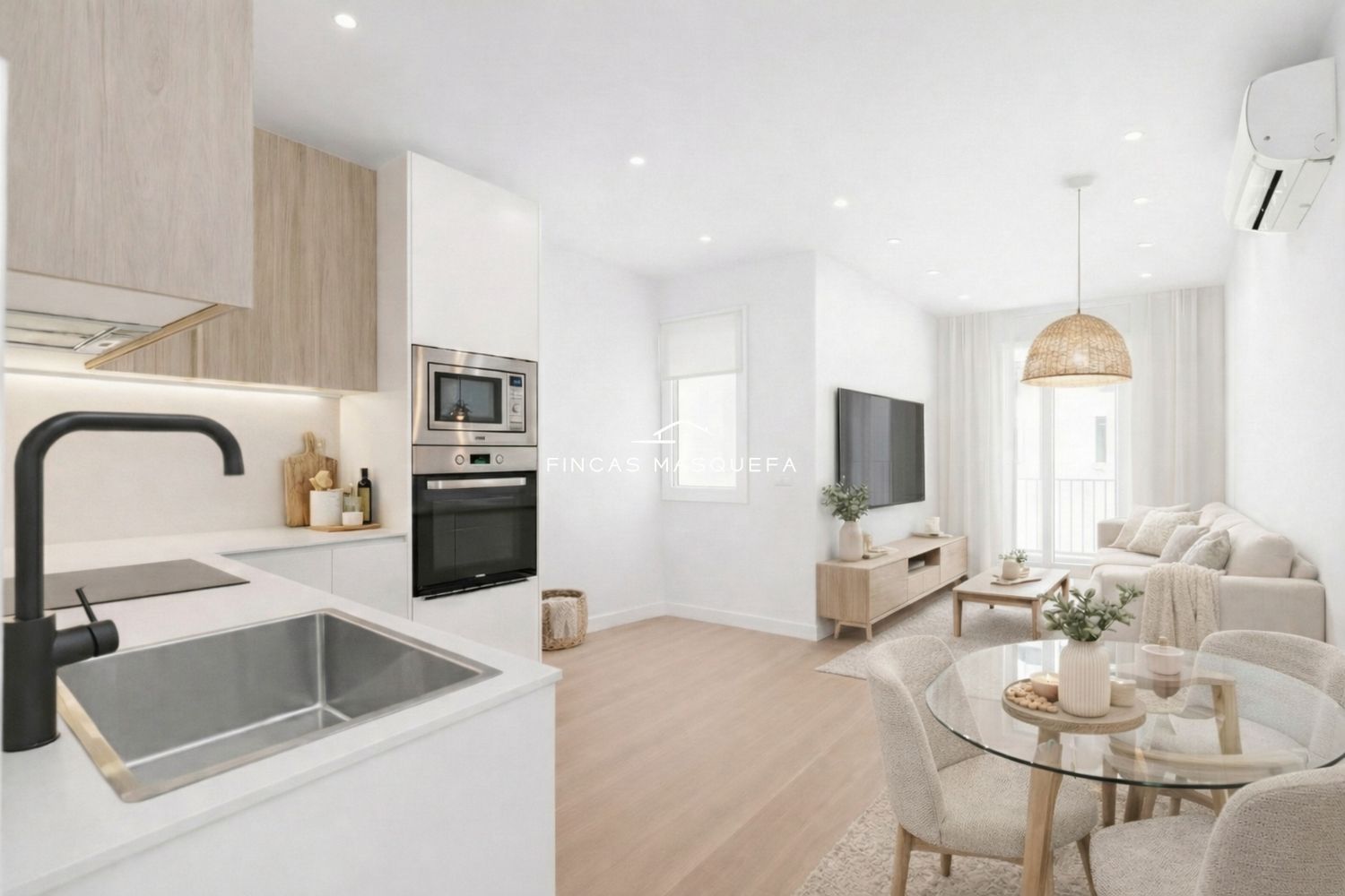 El salón-cocina-comedor en concepto abierto es amplio y luminoso, con tres ambientes diferenciados: cocina, zona sofá tv y mesa comedor. La cocina está equipada con electrodomésticos, lavavajillas panelado.